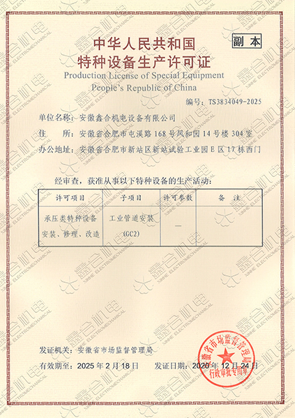 目前我公司具有建筑機電安裝工程專業(yè)承包一級資質(zhì)、總承包二級、GC2壓力管道設(shè)計、施工資質(zhì)?,F(xiàn)有高級工程師5名、高級技師55名、工程師22名、助工25名、技術(shù)員22名、各類專業(yè)技師50多名,強大的技術(shù)力量及精良的施工隊伍,為客戶提供全方位服務。 公司本著“一切為了用戶”的經(jīng)營理念,“以品質(zhì)求生存、以誠信贏市場、以管理促發(fā)展”為要求,努力為廣大客戶提供專業(yè),優(yōu)質(zhì)、高效的服務。